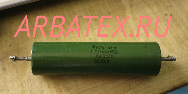 К75-47В 16кВ 0,01мкФ конденсатор комбинированный, фольговый, уплотненный, неизолированный, постоянной емкости, предназначен для работы в качестве встроенных элементов внутреннего монтажа аппаратуры (в кожухе комплектного изделия) в цепях постоянного и пульсирующего токов и в импульсных режимах с частичной разрядкой емкости.
