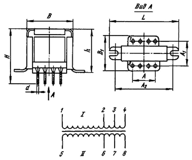Расположение выводов трансформаторов подобно цоколевке электровакуумных приборов и реле. Имеется ключ и дополнительная маркировка первого вывода на боковой поверхности трансформатора (красная точка). Отсчет выводов производится по часовой стрелке со стороны монтажа. При этом первый вывод расположен в левом верхнем углу. Каркас трансформаторов получает дополнительную жесткость от армирования его жесткими выводами, расстояние между которыми равно шагу координатной сетки печатной платы.
